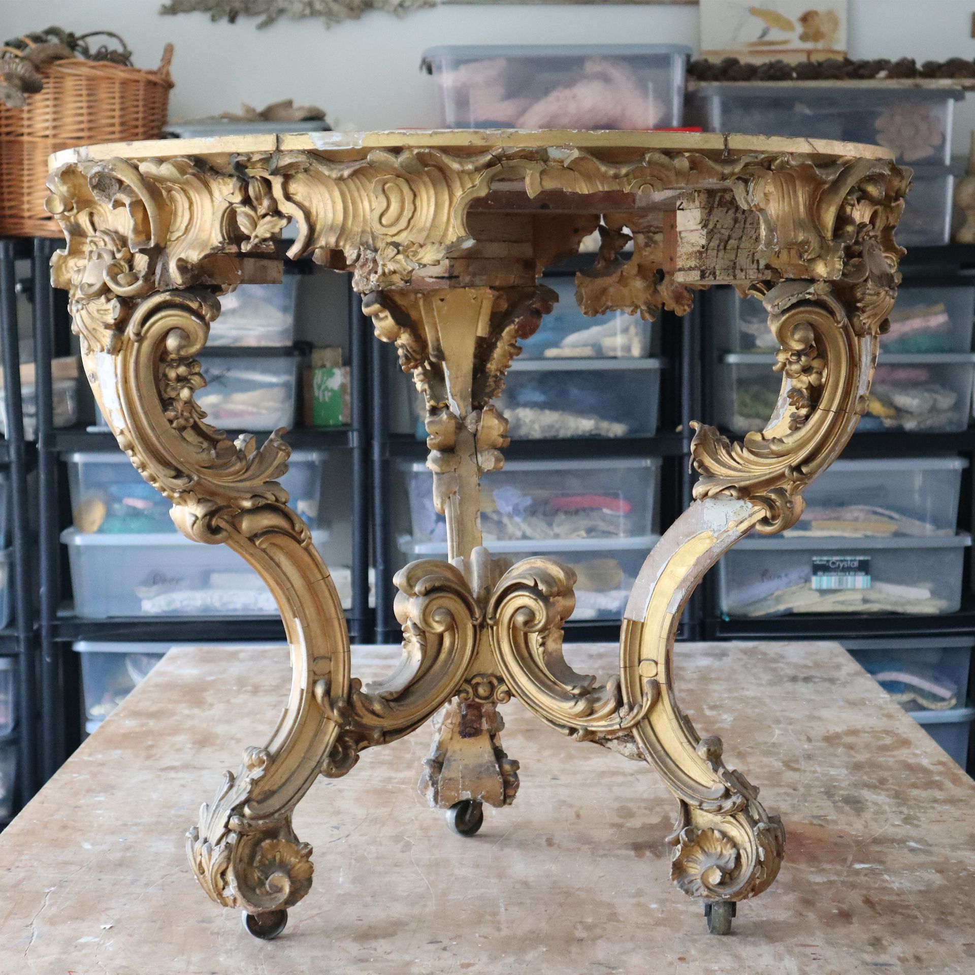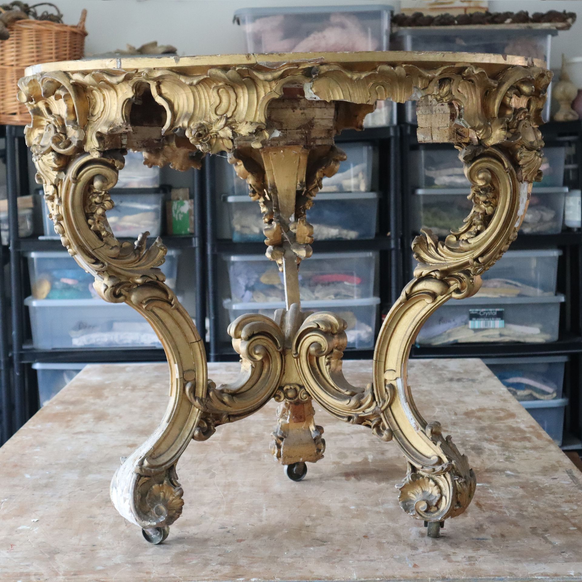A giltwood console table restoration. Lots of small gesso repairs all over the table, gilded the repairs and aged to match.