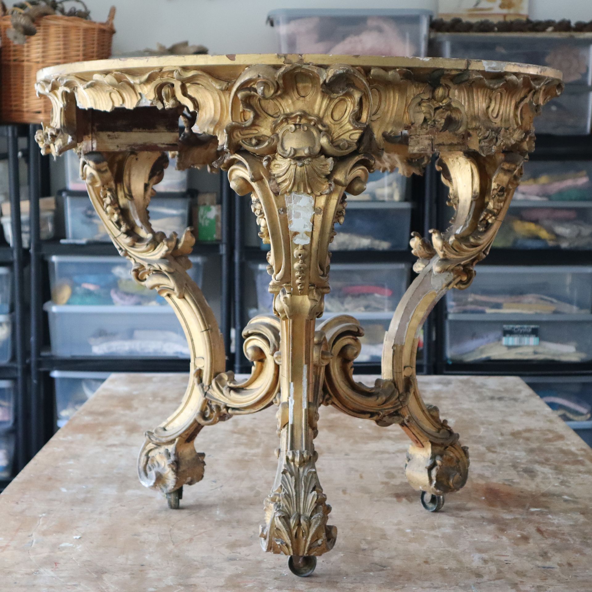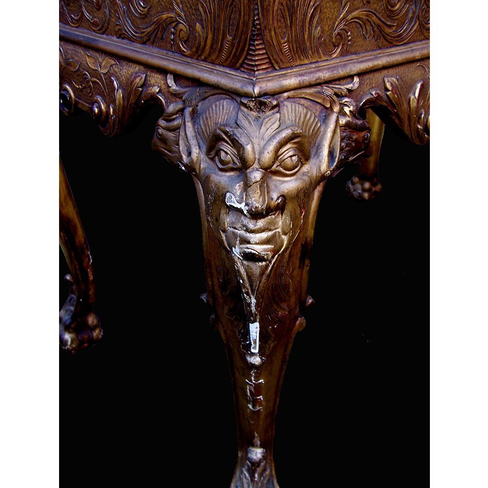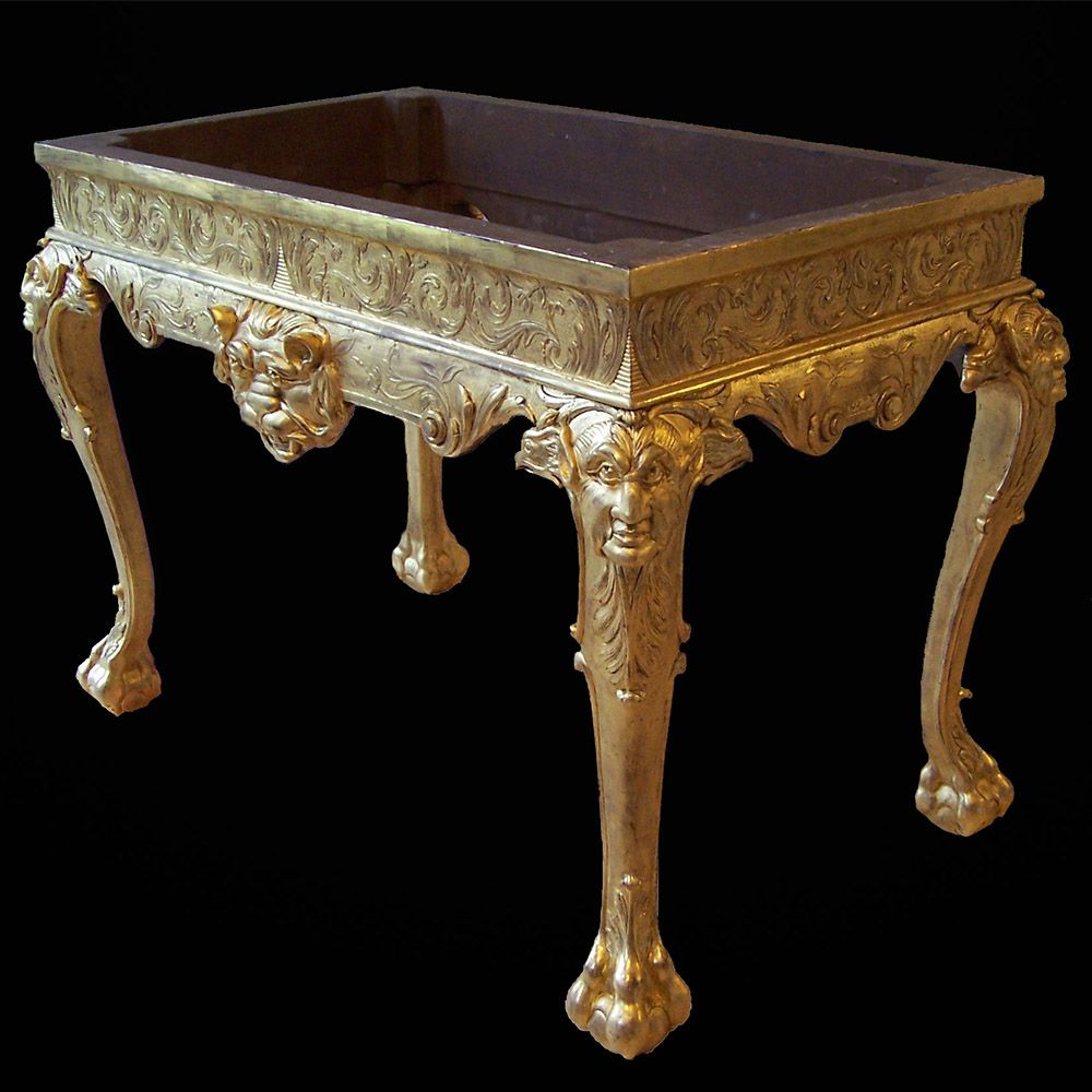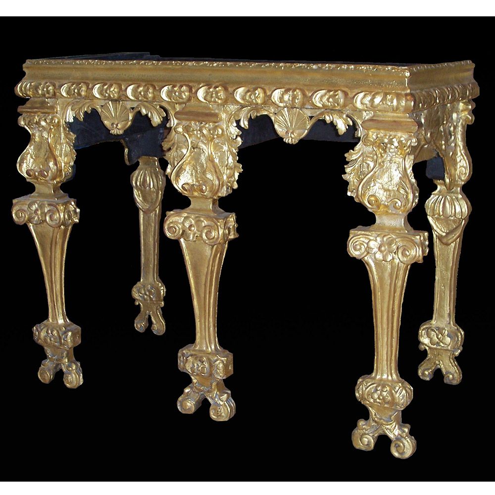 A Thomas Johnson giltwood console table restoration. This console table was restored for the TV show Salvage Hunters The Restorers, Season 3 episode 2. A layer of brown gesso was removed, all old repairs removed, Missing decoration replaced, loose gesso secured, missing gesso replaced, Then a full re-gild and aged.