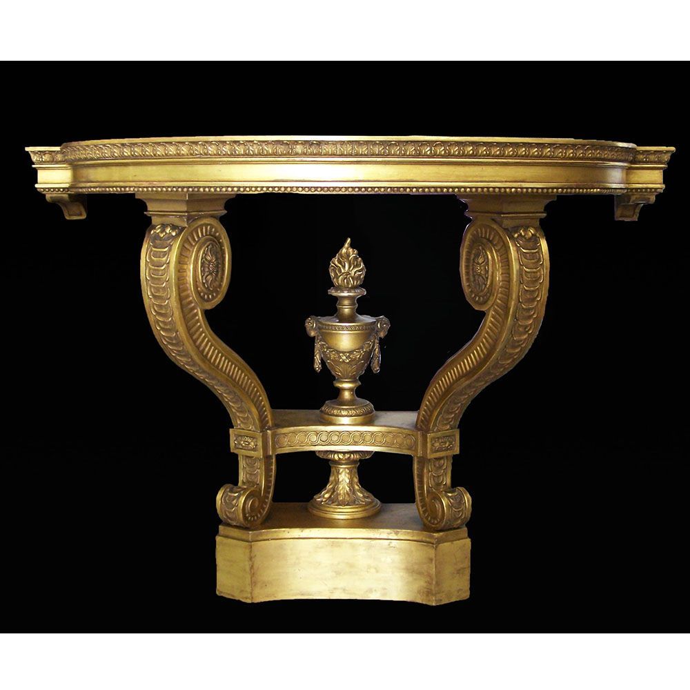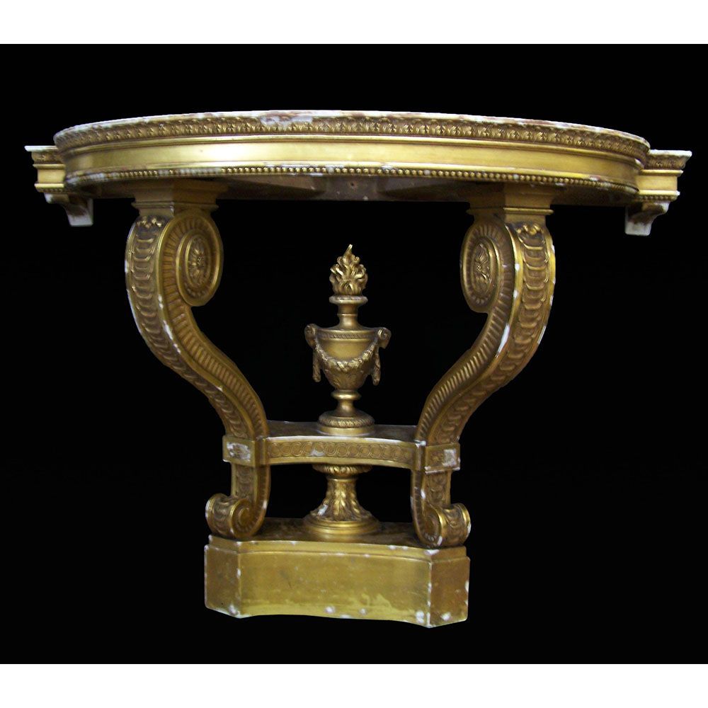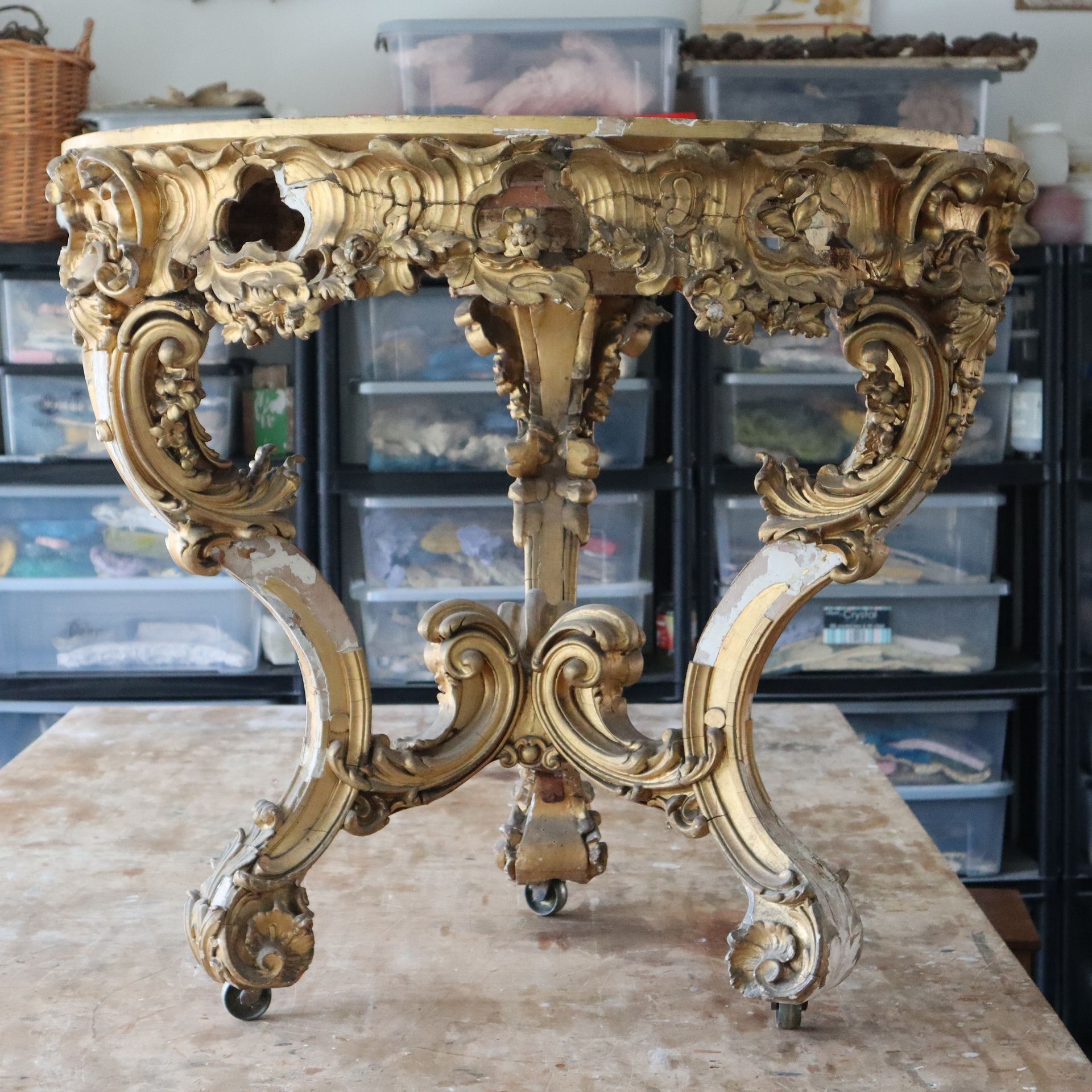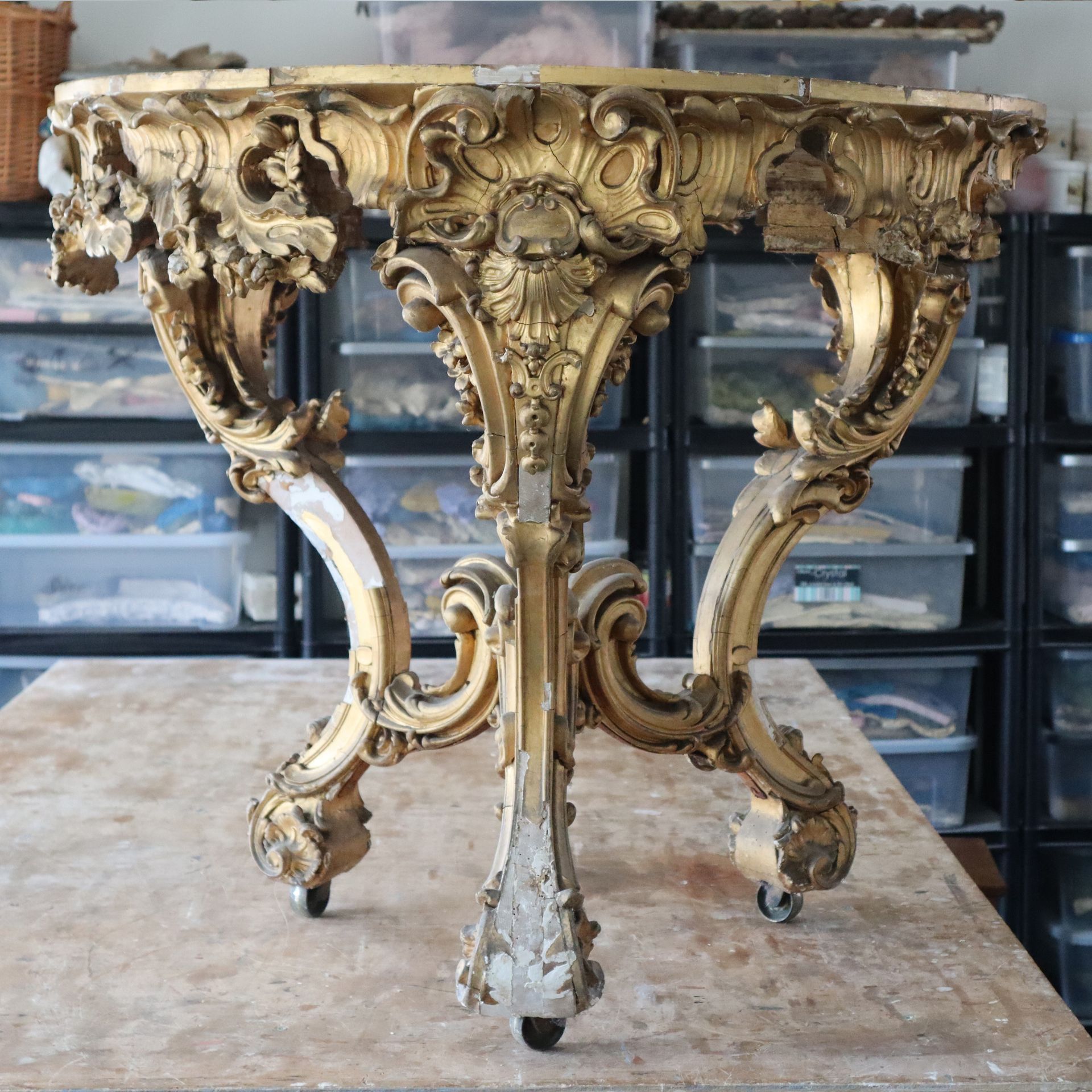 A Thomas Johnson giltwood console table restoration. This console table was restored for the TV show Salvage Hunters The Restorers, Season 3 episode 2. A layer of brown gesso was removed, all old repairs removed, Missing decoration replaced, loose gesso secured, missing gesso replaced, Then a full re-gild and aged.