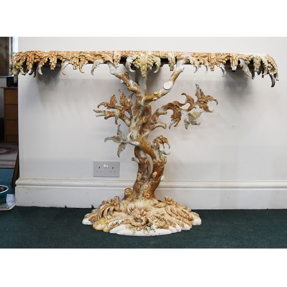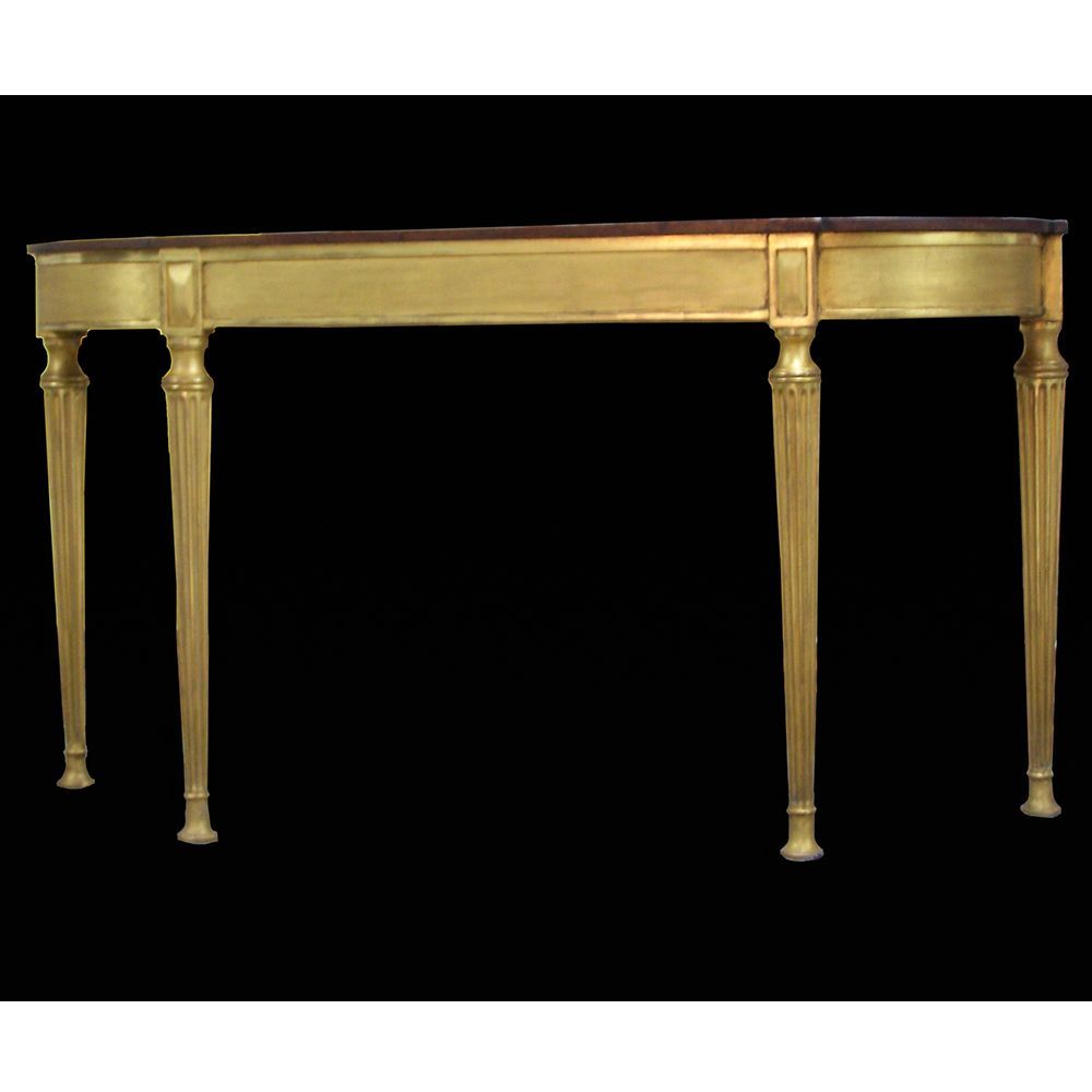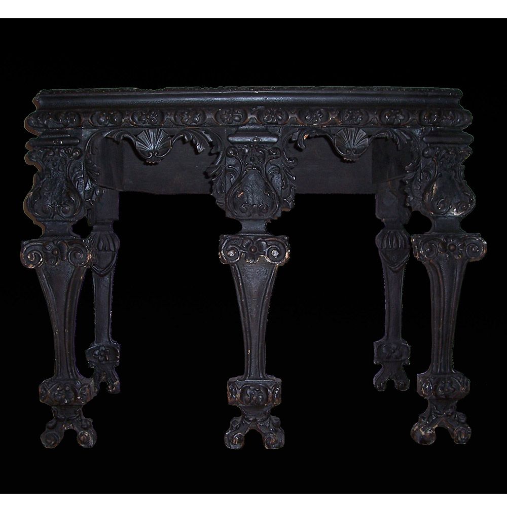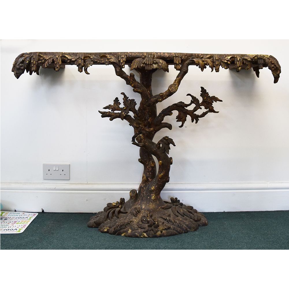 A Thomas Johnson giltwood console table restoration. This console table was restored for the TV show Salvage Hunters The Restorers, Season 3 episode 2. A layer of brown gesso was removed, all old repairs removed, Missing decoration replaced, loose gesso secured, missing gesso replaced, Then a full re-gild and aged.