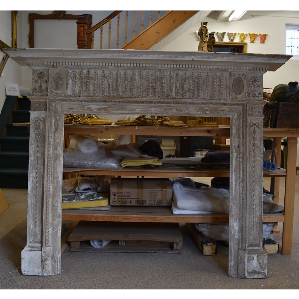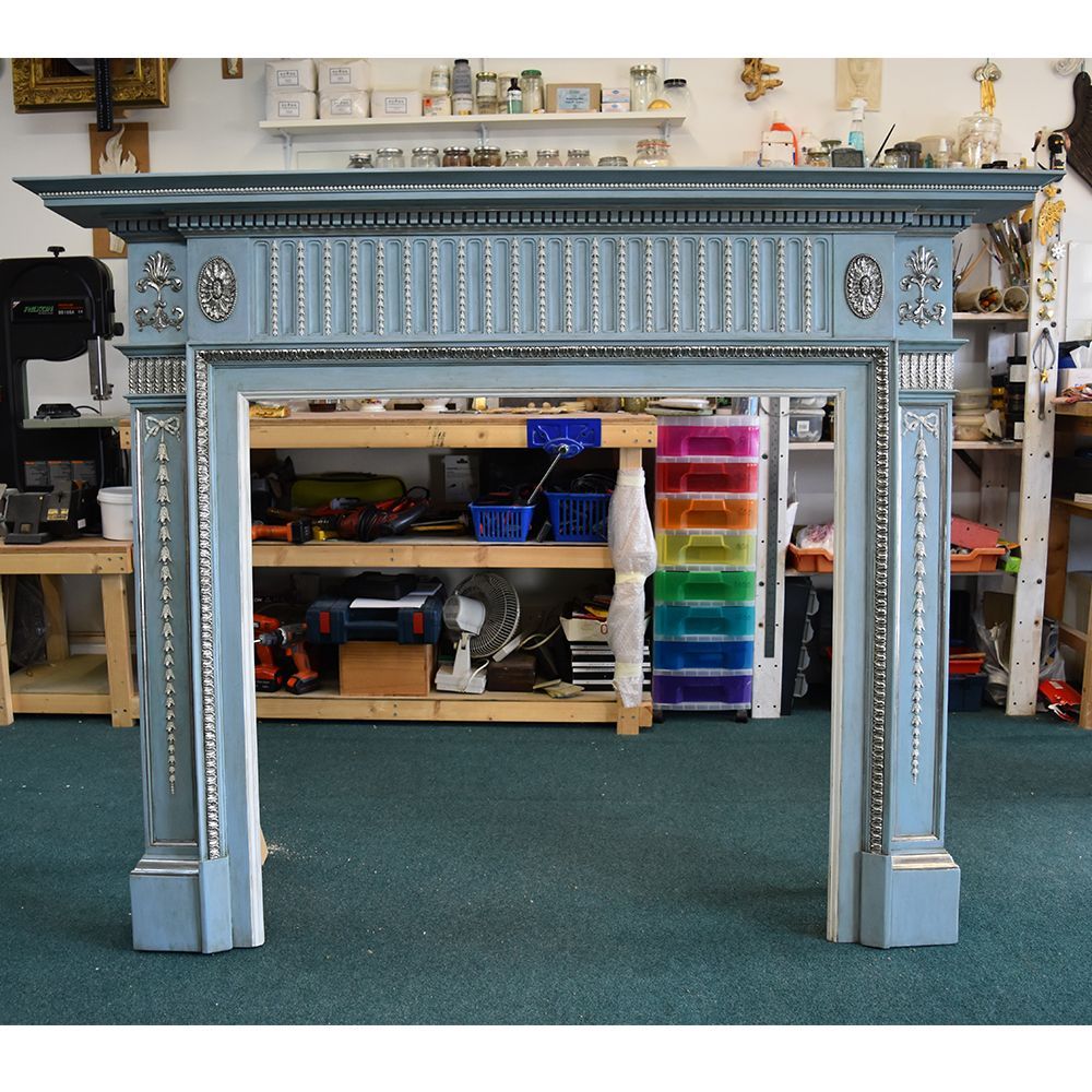 An Adam style fire place. This piece was restored for the TV show Salvage Hunters The Restorers, Season 5 episode 16. Someone had tryed to strip the layers of paint off with a heat gun. This had melted most of the compo decoration. I removed the rest of the paint, replaced the missing and damaged compo decoration, gilded in tin leaf and painted the rest in a Wedgewood blue and a off white paint.