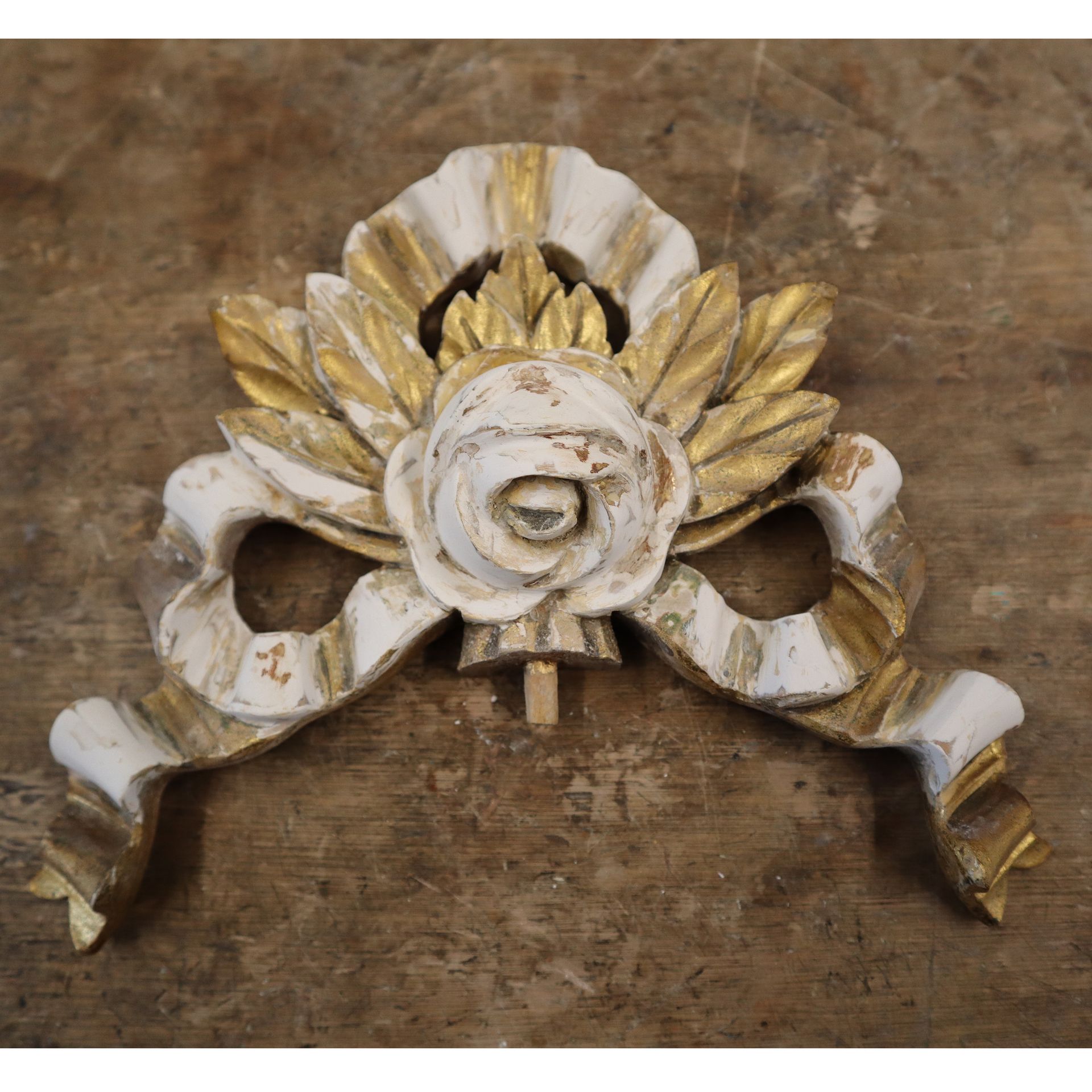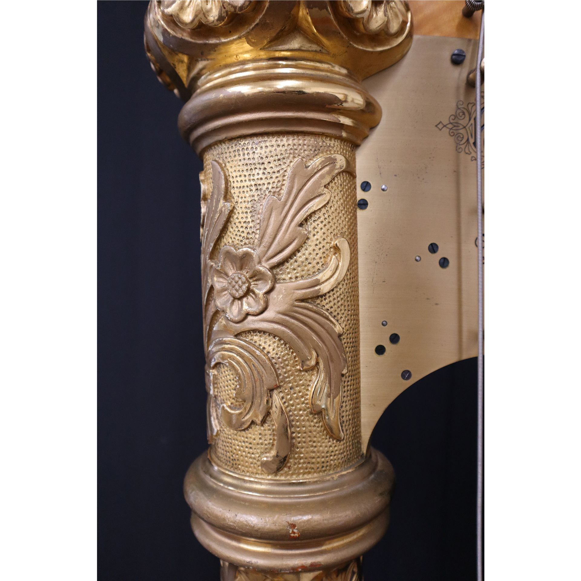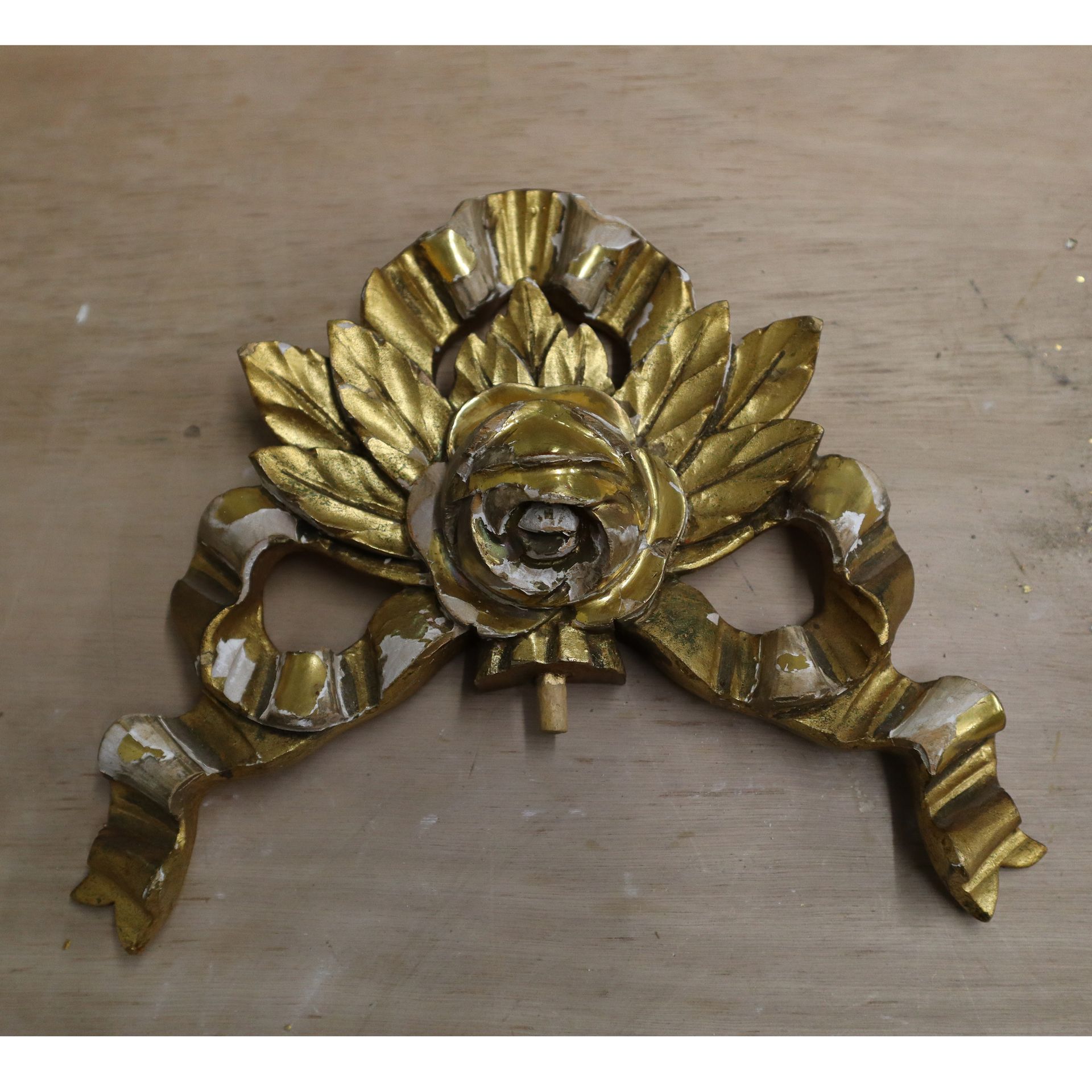 A giltwood clock top decoration. Loose gesso removed, gesso repairs, gilded.