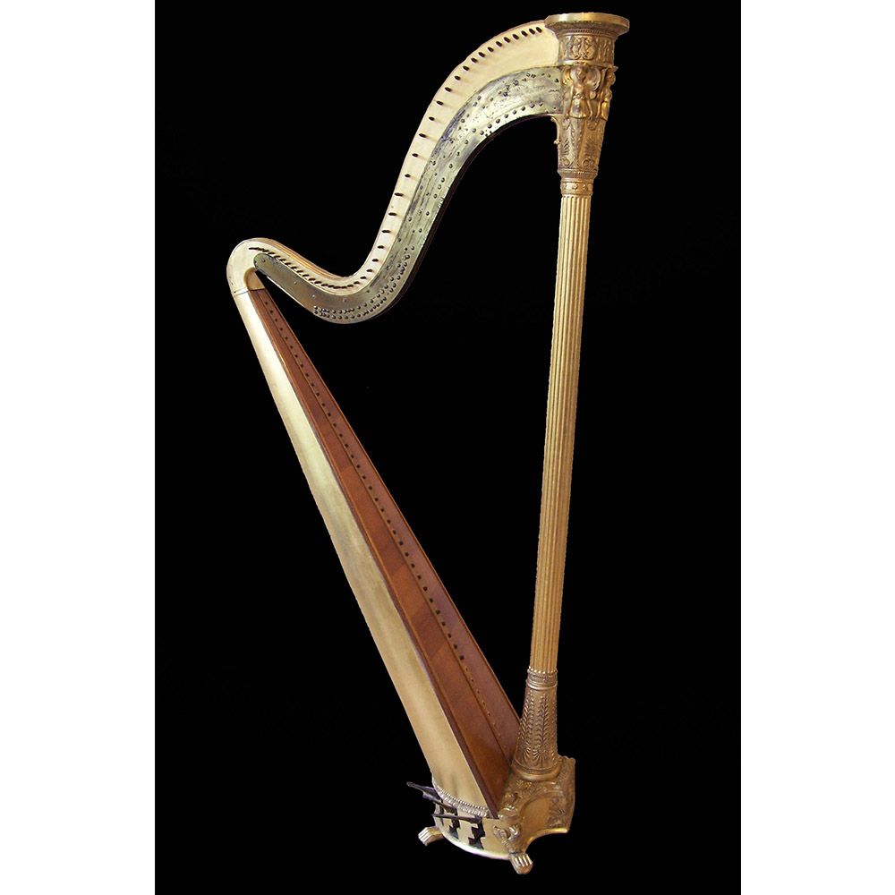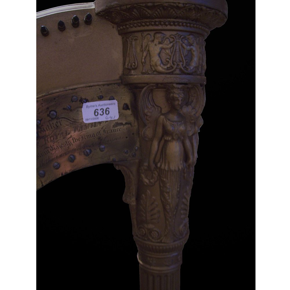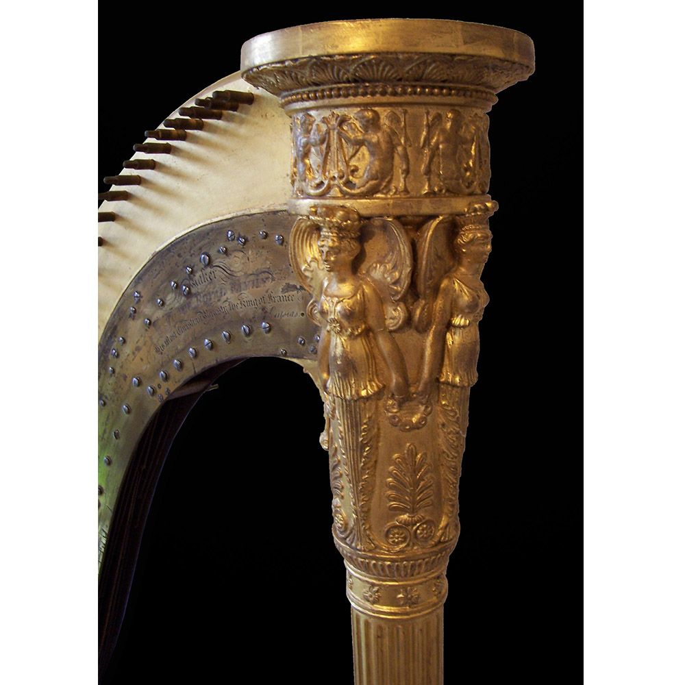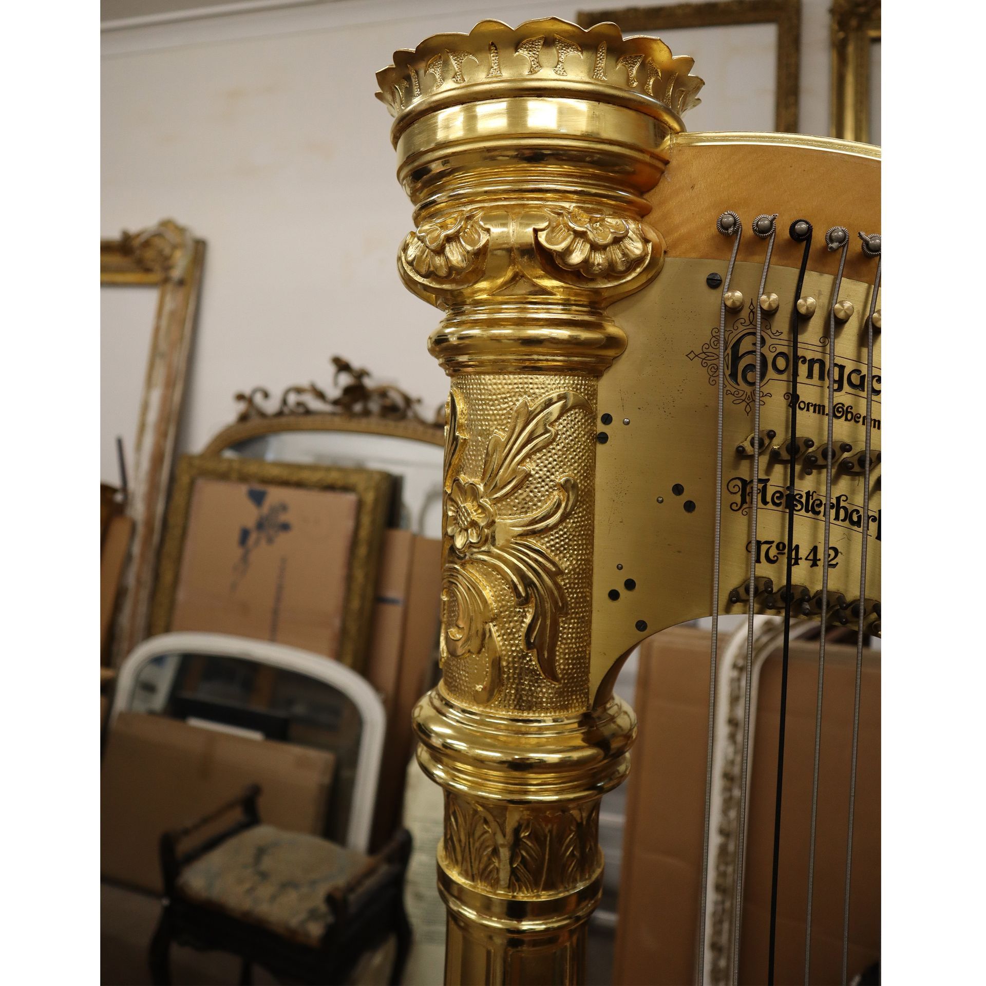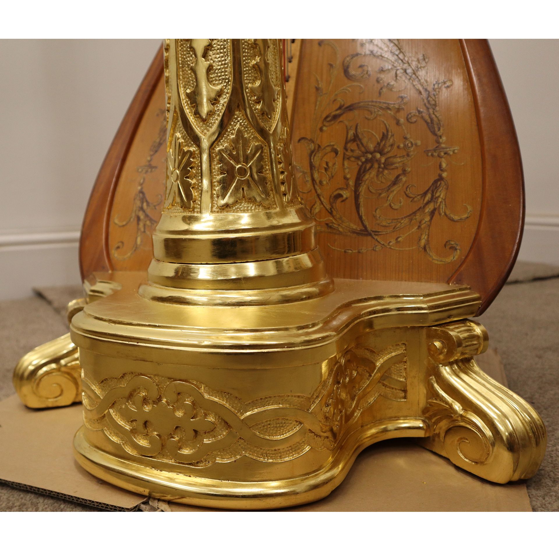Gilded harp restoration. Removed the paint, repairs to the missing gesso and compo decoration, then a full re-gild.